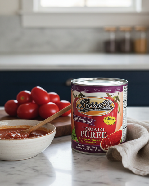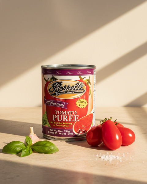 Borrelli Tomato Puree is the perfect consistency for cooking. Cook tomato puree with our Borrelli Minced Garlic and Extra Virgin Olive Oil. Finish with a sprinkle of sea salt and mix with our Borrelli pasta! Tomato puree is a great addition to your favorite home-made sauces, tomato soup and any of your favorite culinary creations. Can also be used to make pizza sauce.